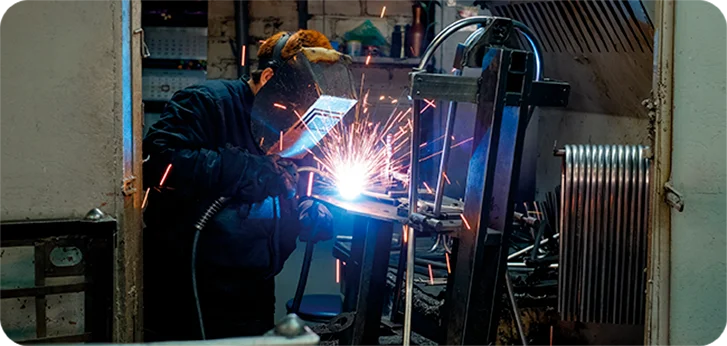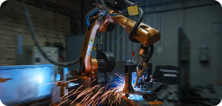 оснащен пролуавтоматическими установками, продуктивно работает робот-сварщик для автоматической сварки металлокаркасов