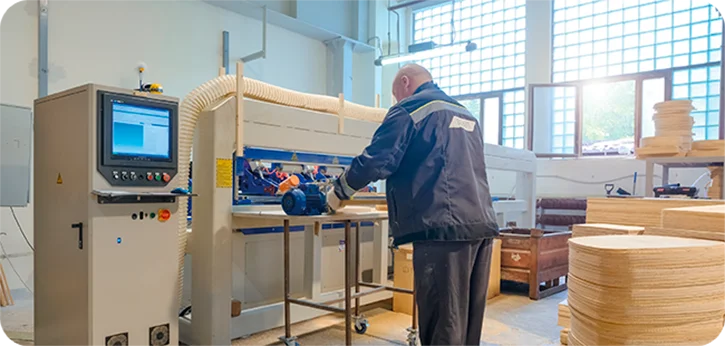 укомплектован форматно-раскроечными, кромкооблицовочными станками, заклепочными автоматами, высокоточными фрезерными деревообрабатывающими центрами с ЧПУ, которые помимо обработки древесины способны изготавливать столешницы из компакт-ламината любых размеров и конфигураций.